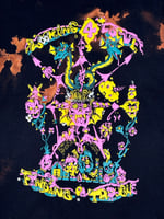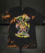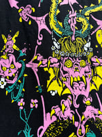 Black heavy cotton t-shirt with four-color screen printing. Front design.