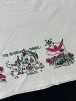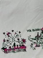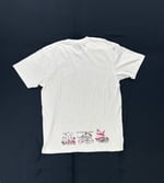 White heavy cotton t-shirt with two-color screen printing. Front and back design.